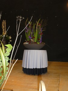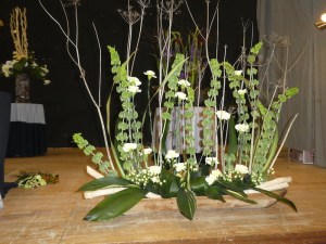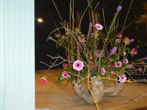 He used some interesting and unusual containers and advocated including natural materials in designs. He found beauty in plant materials that had changed colour and form, and happily used dried material found in the countryside. He believed strongly in using seasonal flowers and urged us not to be tempted to buy tulips until January. Nick gave us many interesting facts and tips too, delivered in a fashion that caused much laughter.